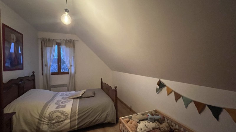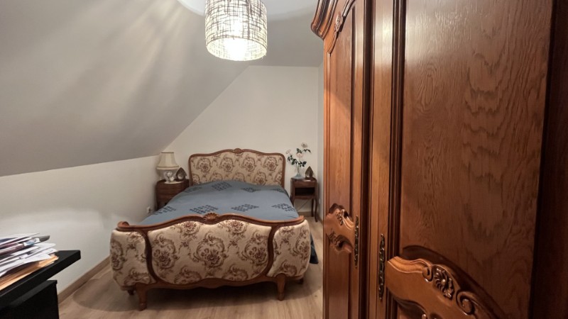 A l'étage: Palier, 3 chambres dont une grande, salle de bains avec wc.