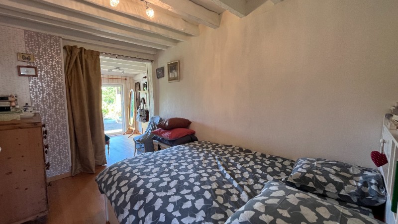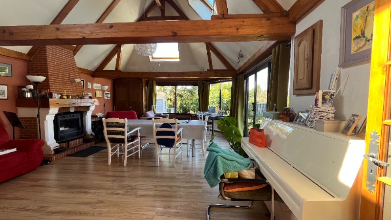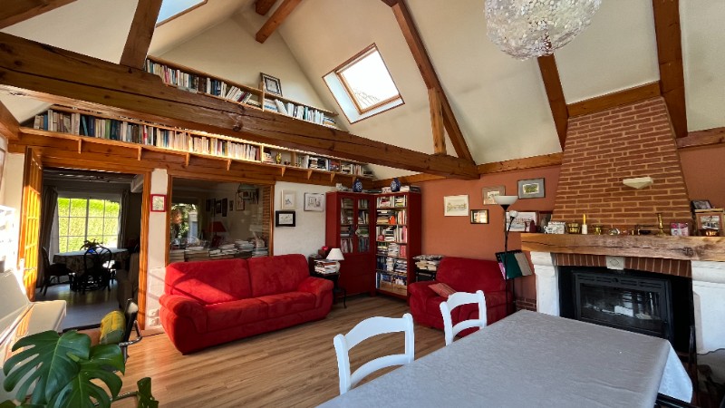 Entrée, cuisine aménagée et équipée avec un coin repas et cheminée insert, arrière cuisine, wc, salle de douche, deux chambres dont une avec dressing, salon d'hiver donnant sur une extension avec cheminée insert, plafond cathédrale qui donne une grande luminosité avec des baies vitrées ouvertes sur le jardin.Au 1er étage: Palier en mezzanine( possibilité chambre / salle de jeux ou bureau), chambre.