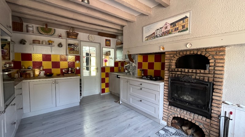 Une entrée, cuisine aménagée et équipée avec un coin repas ainsi qu'une cheminée insert, arrière cuisine donnant sur la terrasse, wc, salle de douche, deux chambres dont une avec un dressing fermé, un salon d'hiver donnant sur une superbe extension avec cheminée insert, plafond cathédrale qui donne une grande luminosité avec des baies vitrées ouvertes sur le jardin.Au 1er étage: un grand palier en mezzanine (possibilité de faire une chambre), chambre.Dépendances avec atelier, laverie, garage, cave à vins, carport, abri bois.Terrain plat, clos et arboré de 1457m². Située dans un secteur calme sans vis-à-vis.